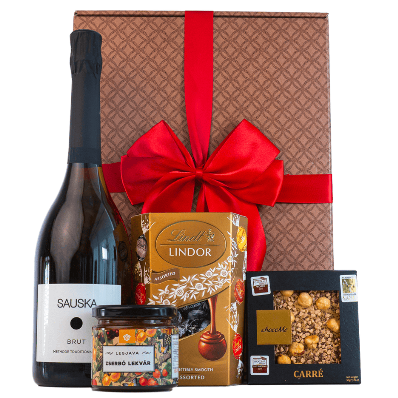 Egy ünnepi összeállítás, ahol a pezsgés és a finom édességek tökéletes harmóniába rendeződnek. A Sauska Brut száraz pezsgő elegáns lendületet visz az alkalomba, amit a Lindor pralinék bársonyos íze, a ChocoMe szőkecsokoládé izgalmas textúrája és a zserbó hangulatát idéző lekvár tesz teljessé. Egy válogatás, amely inkább emlékeket teremt, mint egyszerűen csak ízeket kínál.